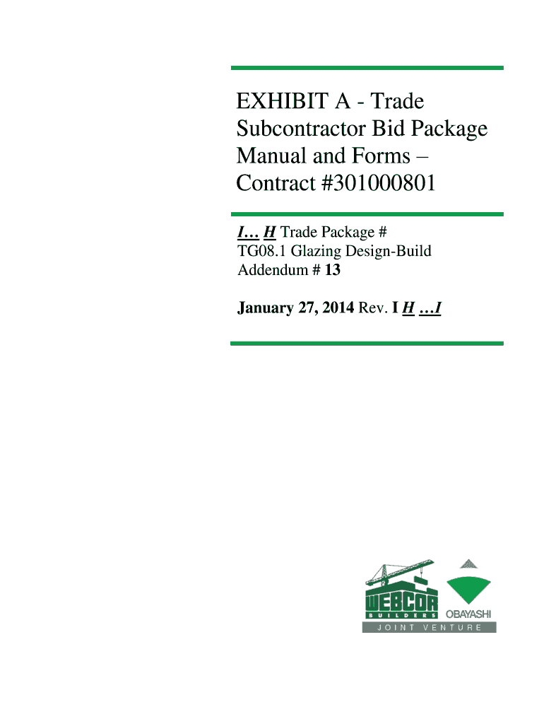 EXHIBIT A Trade Subcontractor Bid Package Manual and Forms Contract #301000801 I H Trade Package # TG08.1 Glazing DesignBuild Addendum # 13 January 27, 2014, Rev. I HI Trade Package TG08.1 Glazing