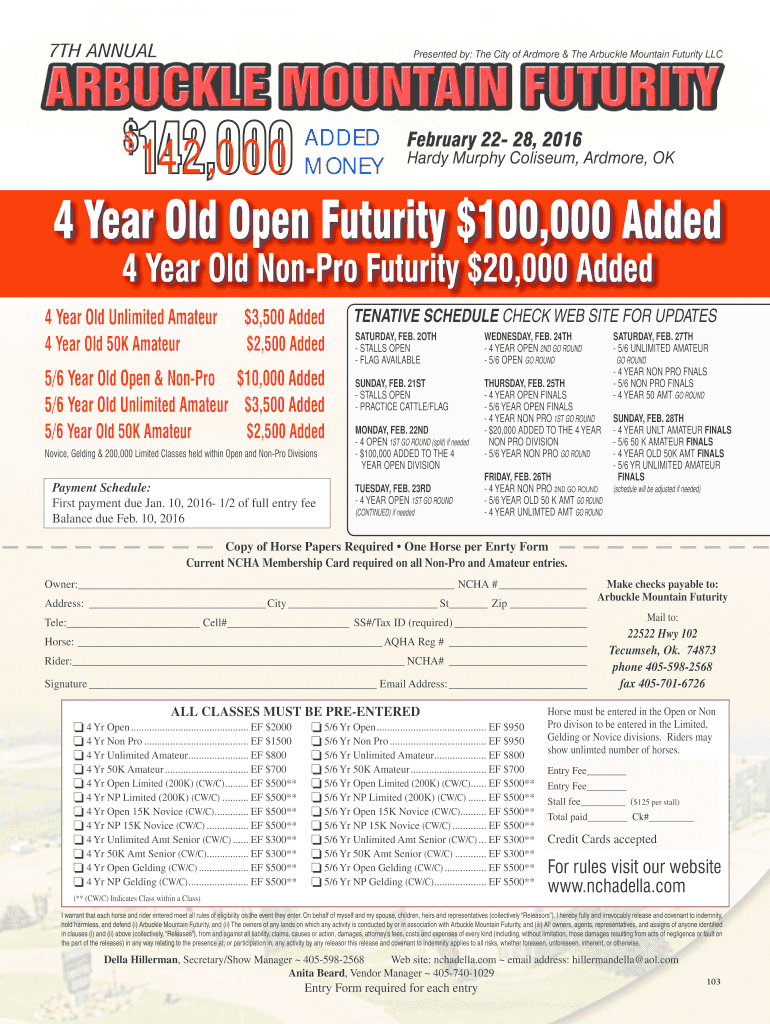 7TH ANNUAL$Presented by: The City of Ardmore & The Ar buckle Mountain Futurity LLC142,000ADDED MONEY February 22 28, 2016Hardy Murphy Coliseum, Ardmore, OK4 Year Old Open Futurity $100,000 Added 4-Year-Old