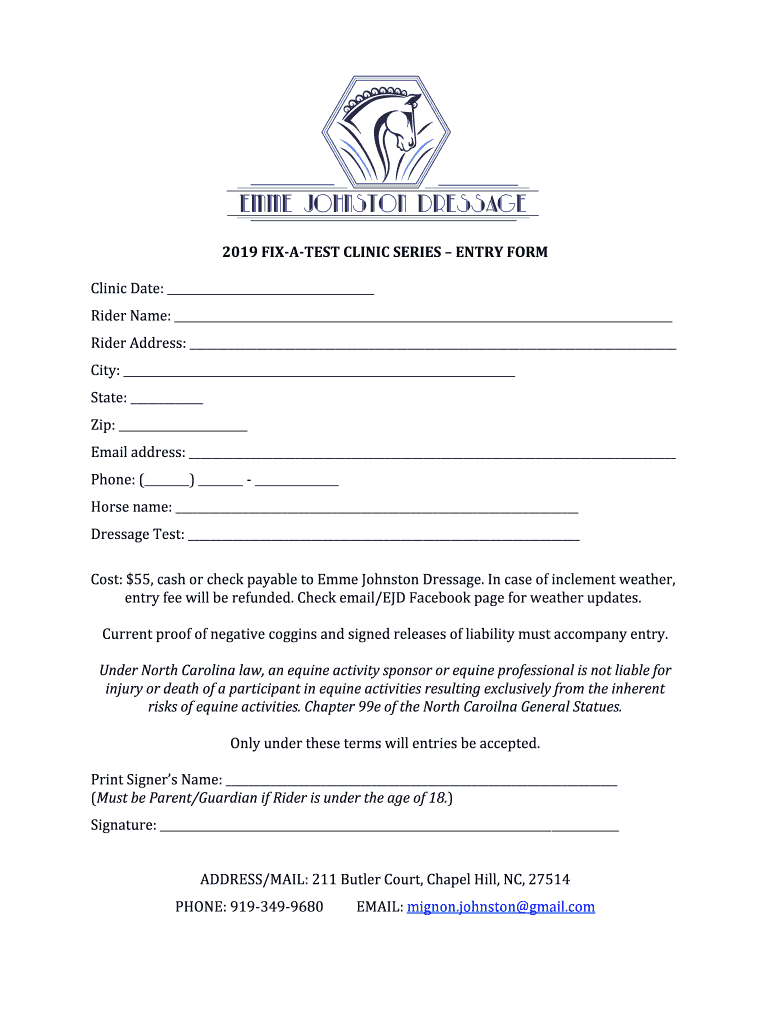 2019%FIX)A)TEST%CLINIC%SERIES%%ENTRY%FORM%!! Clinic! Date:! ! Rider! Name:! ! Rider! Address:! ! City:! ! State:! ! Zip:! ! Email!address:! ! Phone:!()! !! ! Horse!name:! ! Dressage! Test:! ! ! Cost:!$55,!cash!or!check!payable!to!