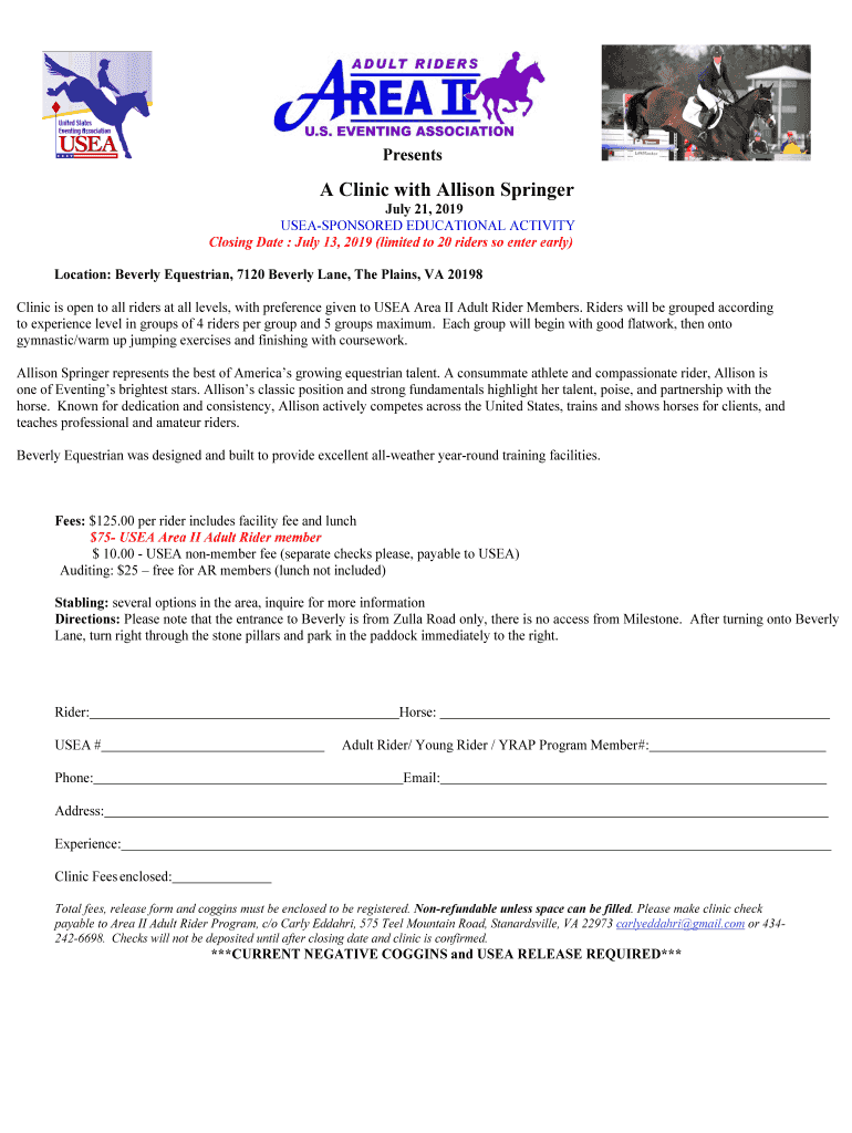 Closing Date : July 13, 2019 (limited to 20 riders so enter early)