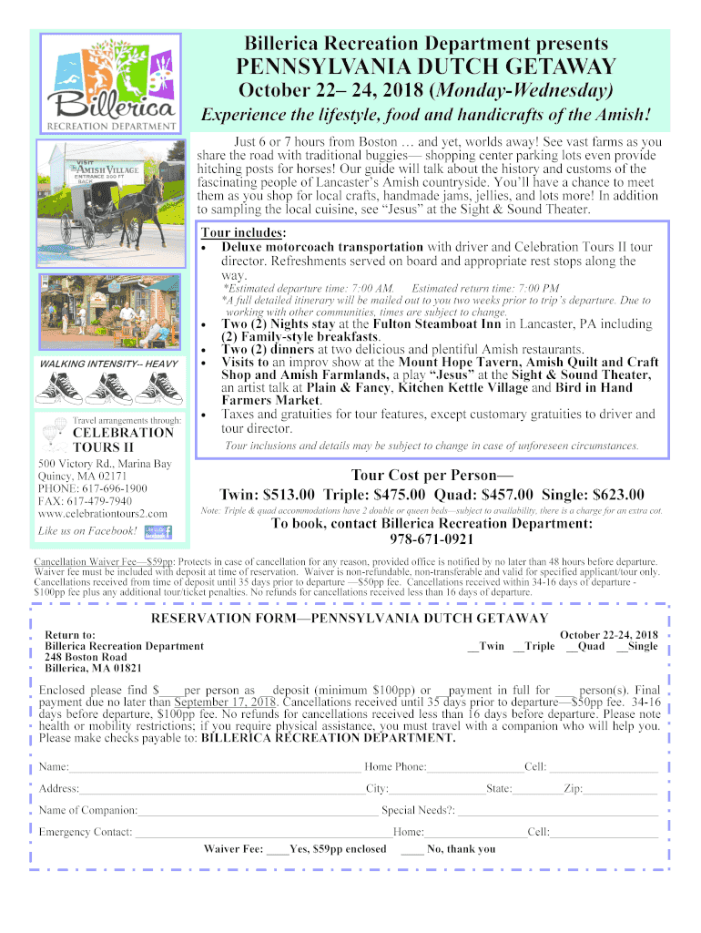 Billerica Recreation Department presentsPENNSYLVANIA DUTCH GETAWAY October 22 24, 2018 (Monday Wednesday)Experience the lifestyle, food and handicrafts of the Amish! Just 6 or 7 hours from Boston