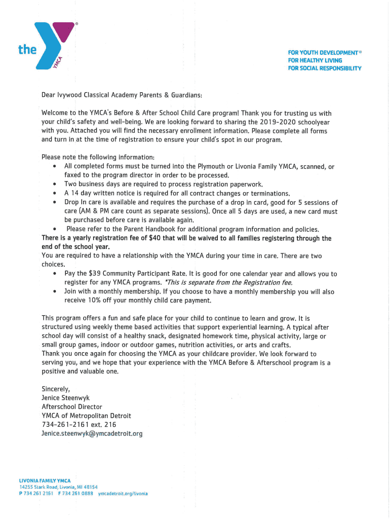 FOR YOUTH DEVELOPMENT FOR HEALTHY LIVING FOR SOCIAL Responsibilities Ivy wood Classical Academy Parents & Guardians:Welcome to the YMCA s Before & After School Child Care program! Thank you for trusting