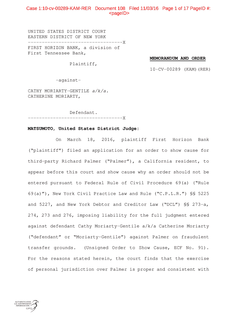 Case 1:10cv00289KAMRER Document 108 Filed 11/03/16-Page 1 of 17 Paged #: