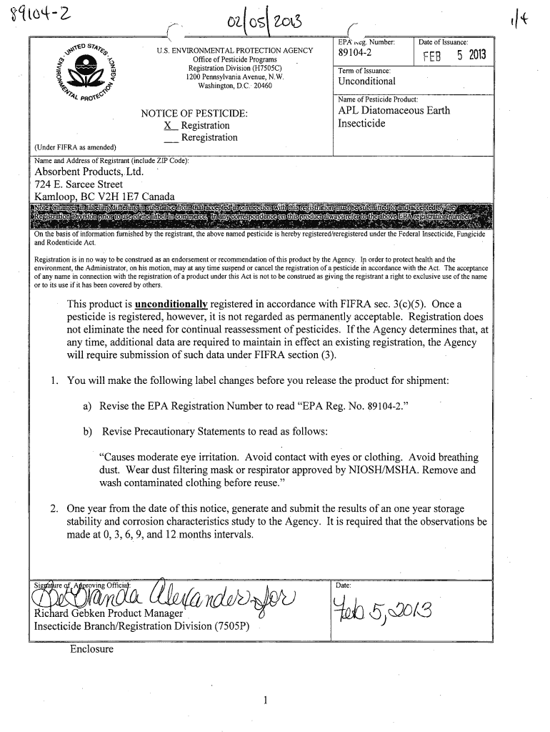Get the free US EPA, Pesticide Product Label, APL DIATOMACEOUS EARTH INSECTICIDE, 02/05/2013. Pes...