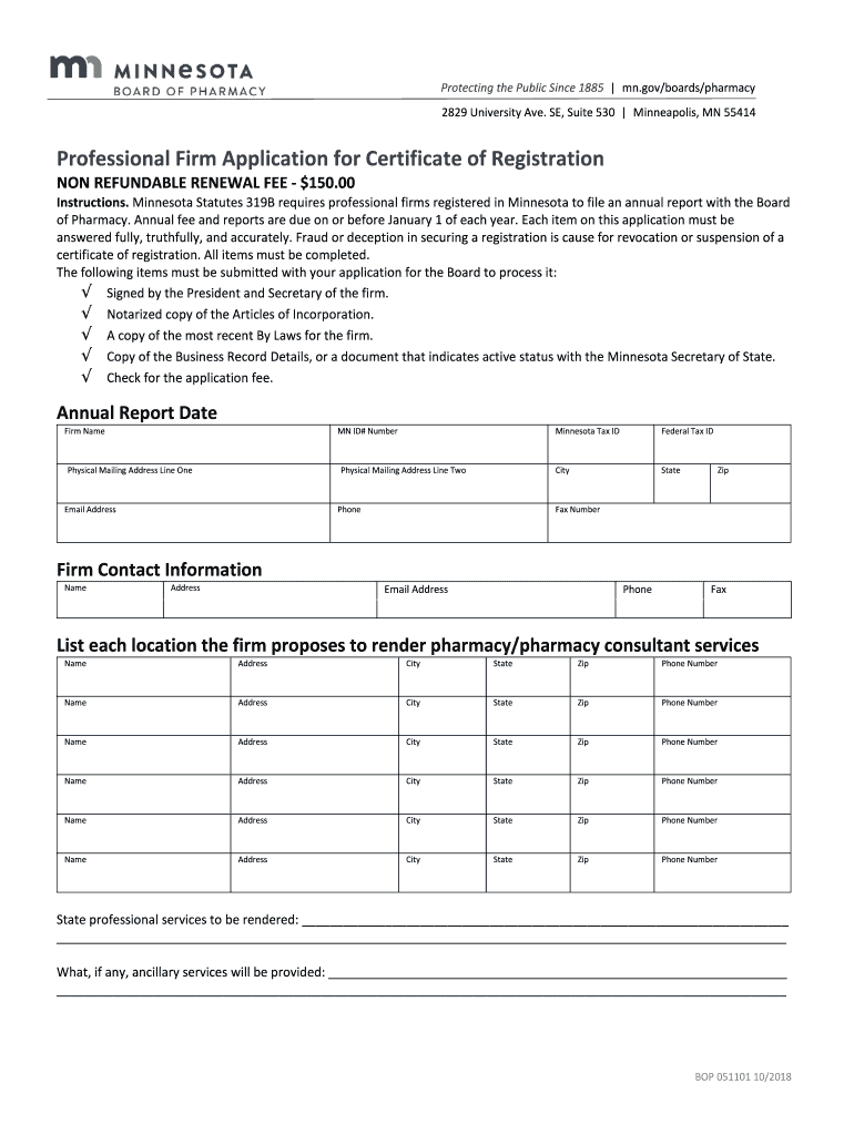 Protecting the Public Since 1885 mn.gov/boards/pharmacy 2829 University Ave. SE, Suite 530 Minneapolis, MN 55414Professional Firm Application for Certificate of Registration NON-REFUNDABLE RENEWAL