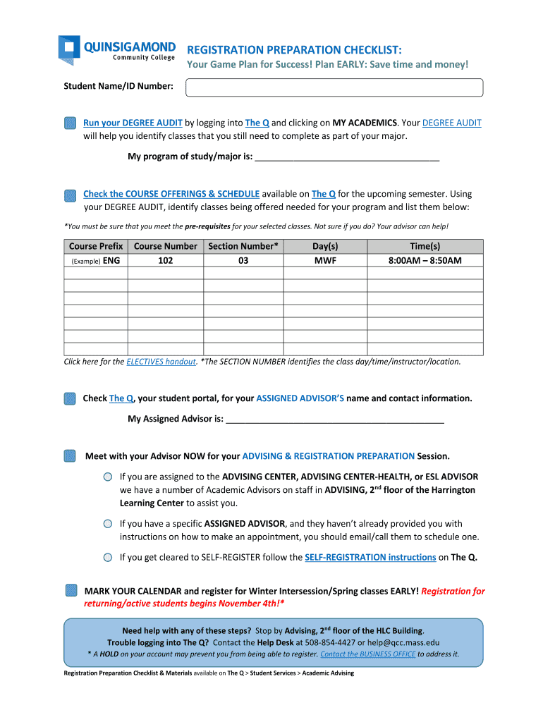 REGISTRATION PREPARATION CHECKLIST: Your Game Plan for Success! Plan EARLY: Save time and money! Student Name/ID Number:Run your DEGREE AUDIT by logging into The Q and clicking on MY ACADEMICS. Your