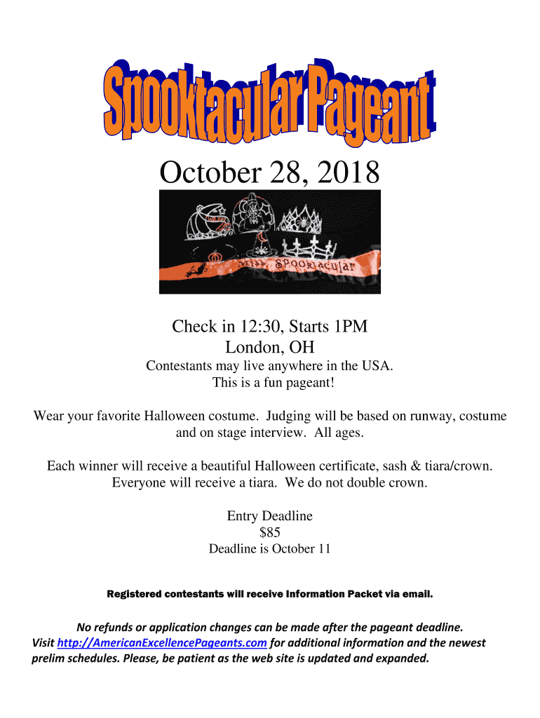 October 28, 2018Check in 12:30, Starts 1PM London, OH Contestants may live anywhere in the USA. This is a fun pageant! Wear your favorite Halloween costume. Judging will be based on runway, costume