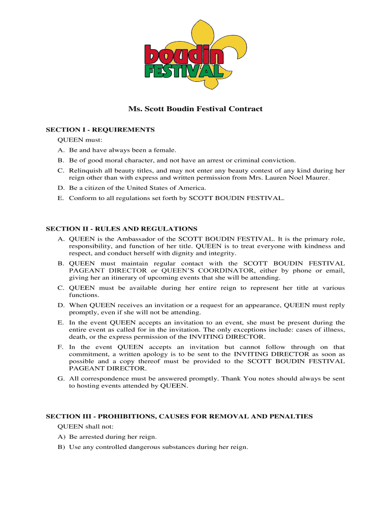 Ms. Scott Boudin Festival Contract SECTION I REQUIREMENTS QUEEN must: A. Be and have always been a female. B. Be of good moral character, and not have an arrest or criminal conviction. C. Relinquish