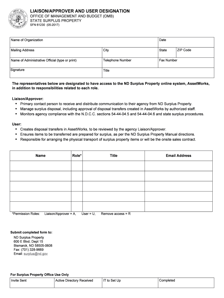 LIAISON/APPROVER AND USER DESIGNATION OFFICE OF MANAGEMENT AND BUDGET (OMB) STATE SURPLUS PROPERTY SON 61230 (052017)Database of Organization ZIP Compiling AddressCityStateName of Administrative Official