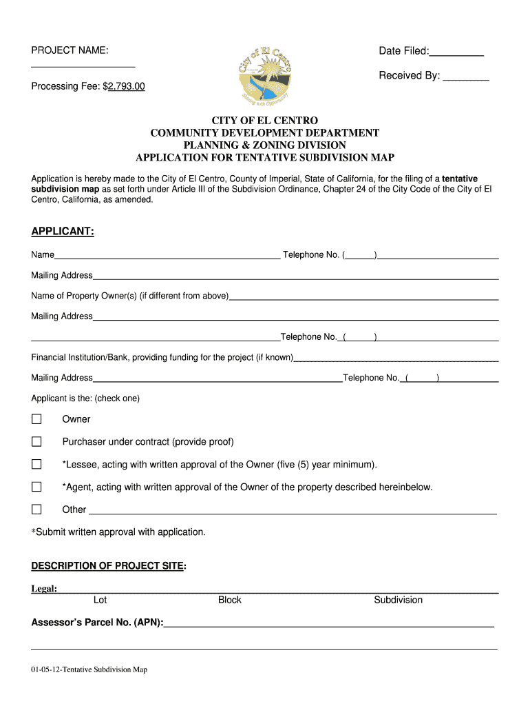 PROJECT NAME:Date Filed: Received By: Processing Fee: $2,793.00CITY OF EL CENTR COMMUNITY DEVELOPMENT DEPARTMENT PLANNING & ZONING DIVISION APPLICATION FOR TENTATIVE SUBDIVISION MAP Application is