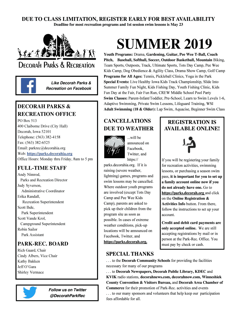 DUE TO CLASS LIMITATION, REGISTER EARLY FOR BEST AVAILABILITY Deadline for most recreation programs and 1st session swim lessons is May 23SUMMER 2019 Like Deborah Parks & Recreation on FacebookDECORAH