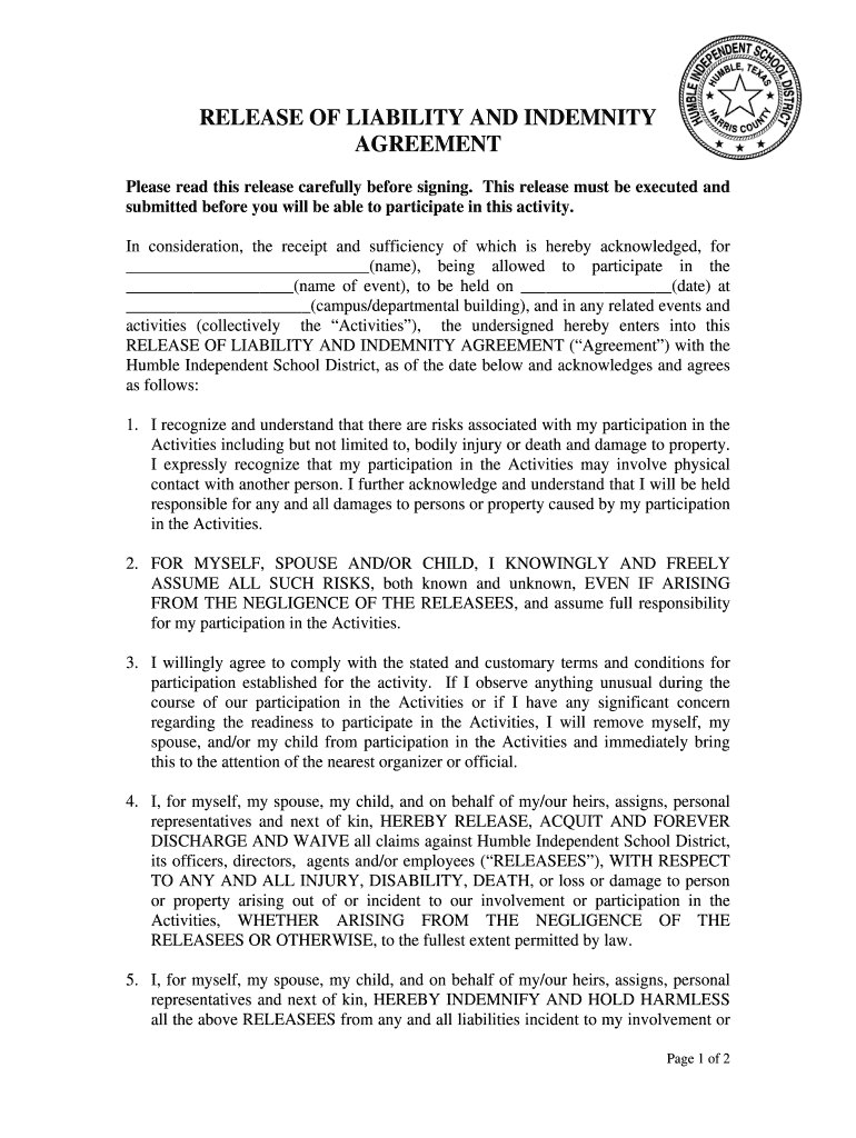 Get the free Humble ISD Release of Liability for General Public Participation(Wavier).doc