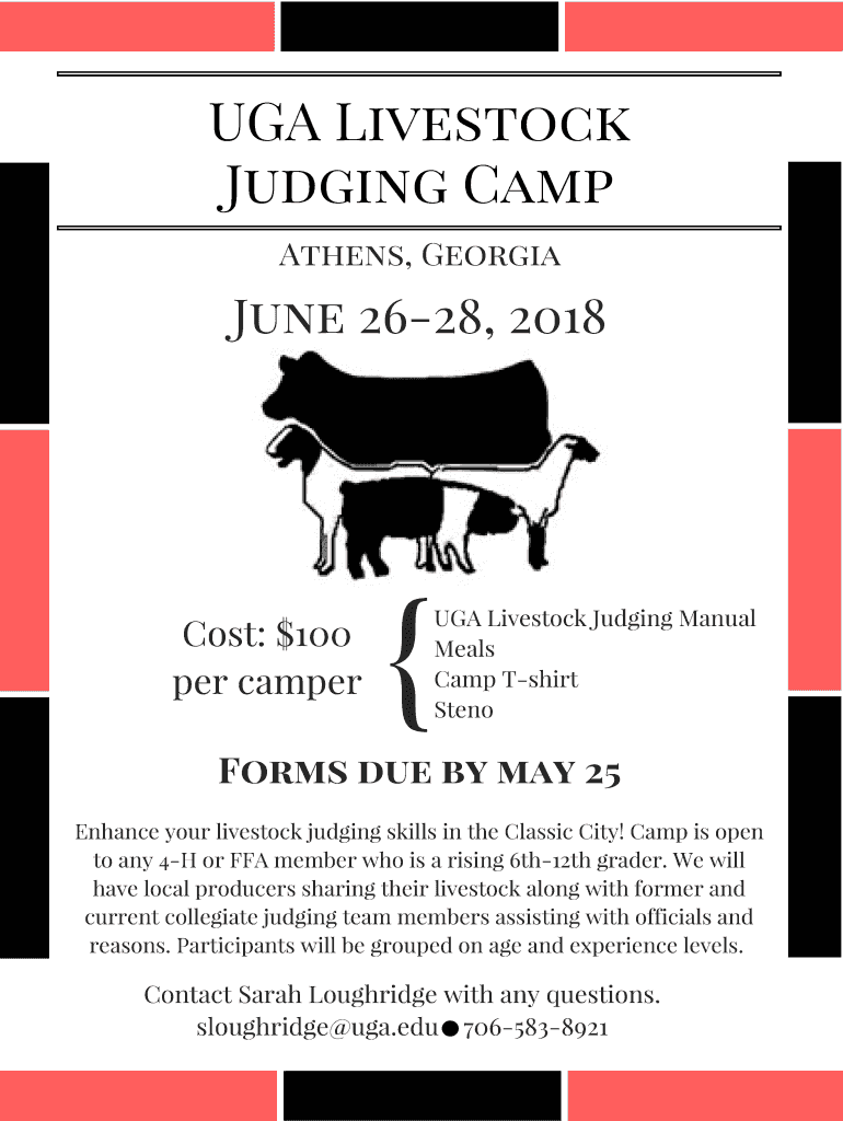 UGA Livestock Judging Camp Athens, Georgia June 2628, 2018 PLEASE PRINT Participant Name: Parent/Guardian: Phone: Address: City: State: Zip: School: Email: Grade: Shirt Size: YSYMYLYXLASAMALAXLAgent/Teacher/Person