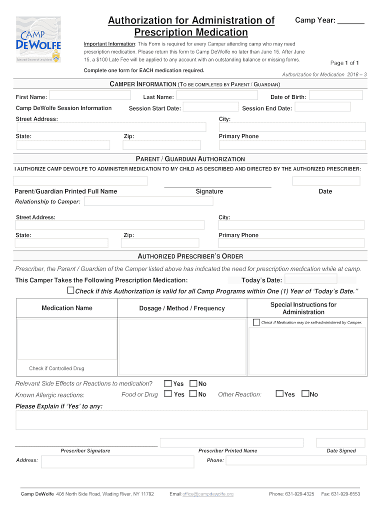Camp Year: Authorization for Administration of Prescription MedicationImportant Information: This Form is required for every Camper attending camp who may need prescription medication. Please return
