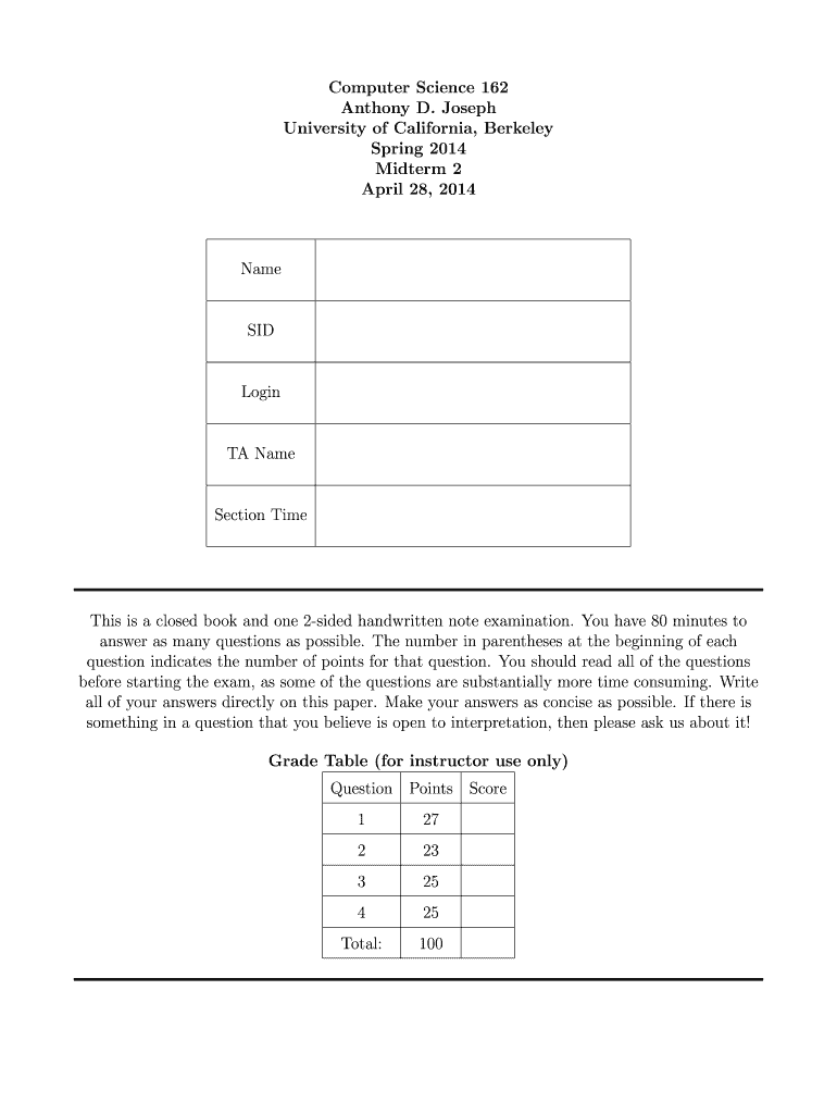 April 28, 2014NameSIDLoginTA Resection Times is a closed book and one 2sided handwritten note examination.