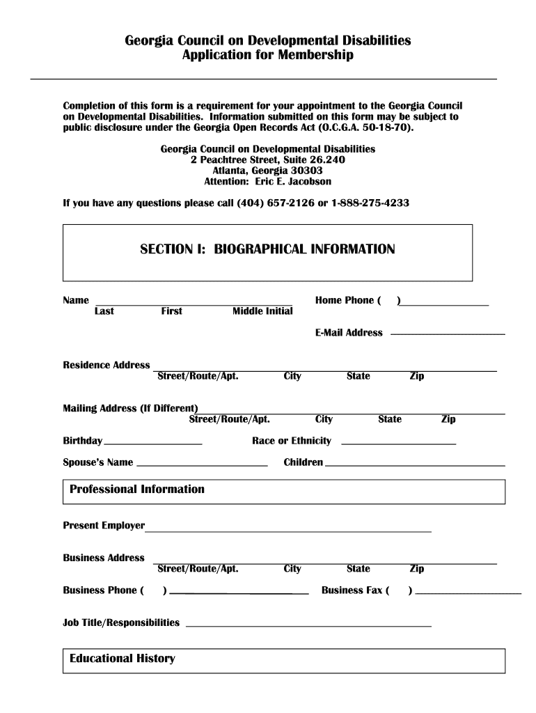 Application for MembershipCompletion of this form is a requirement for your appointment to the Georgia Council