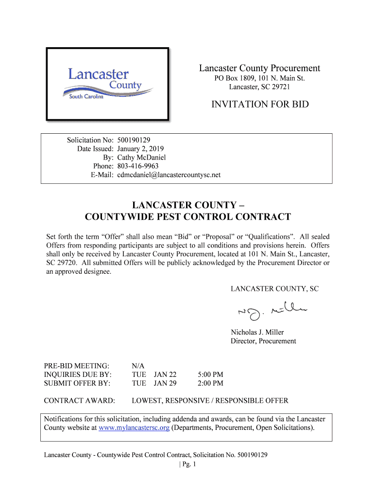 Lancaster County Procurement PO Box 1809, 101 N. Main St. Lancaster, SC 29721INVITATION FOR Solicitation No: Date Issued: By: Phone: Email:500190129 January 2, 2019, Cathy McDaniel 8034169963 McDaniel