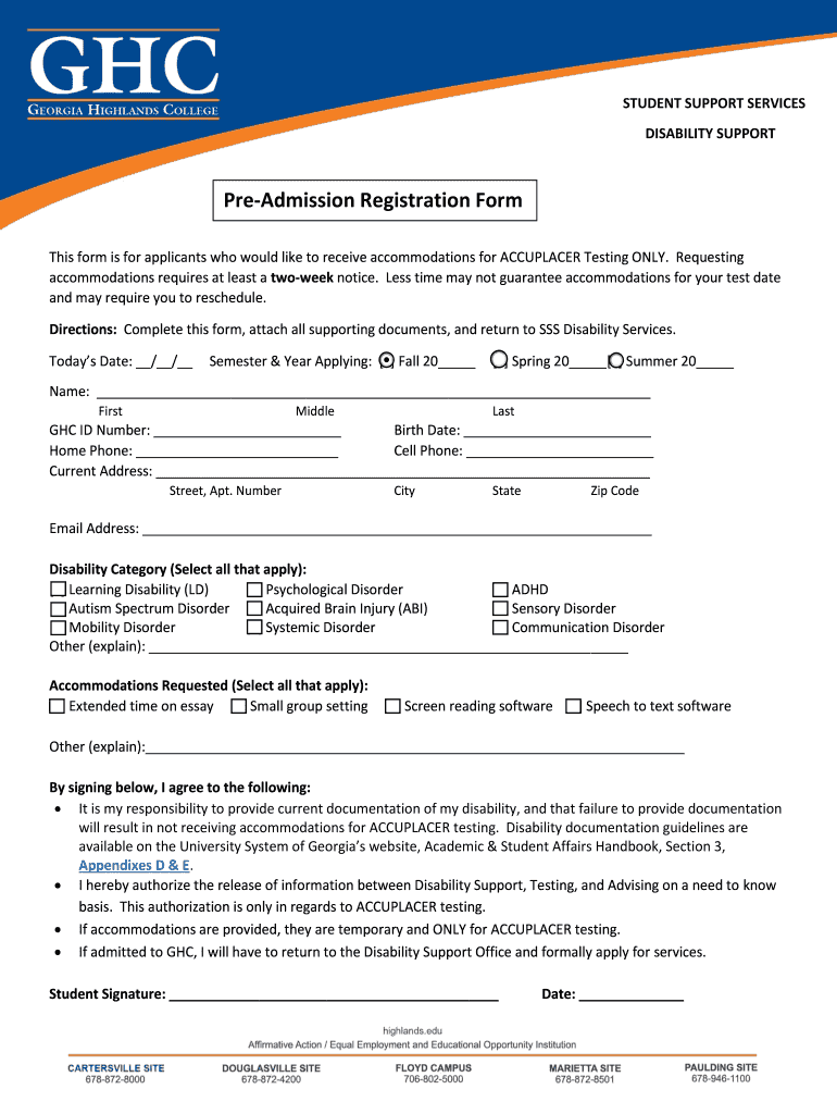 Georgia Highlands College Pre-Admission Registration Form 2019-2025 free printable template