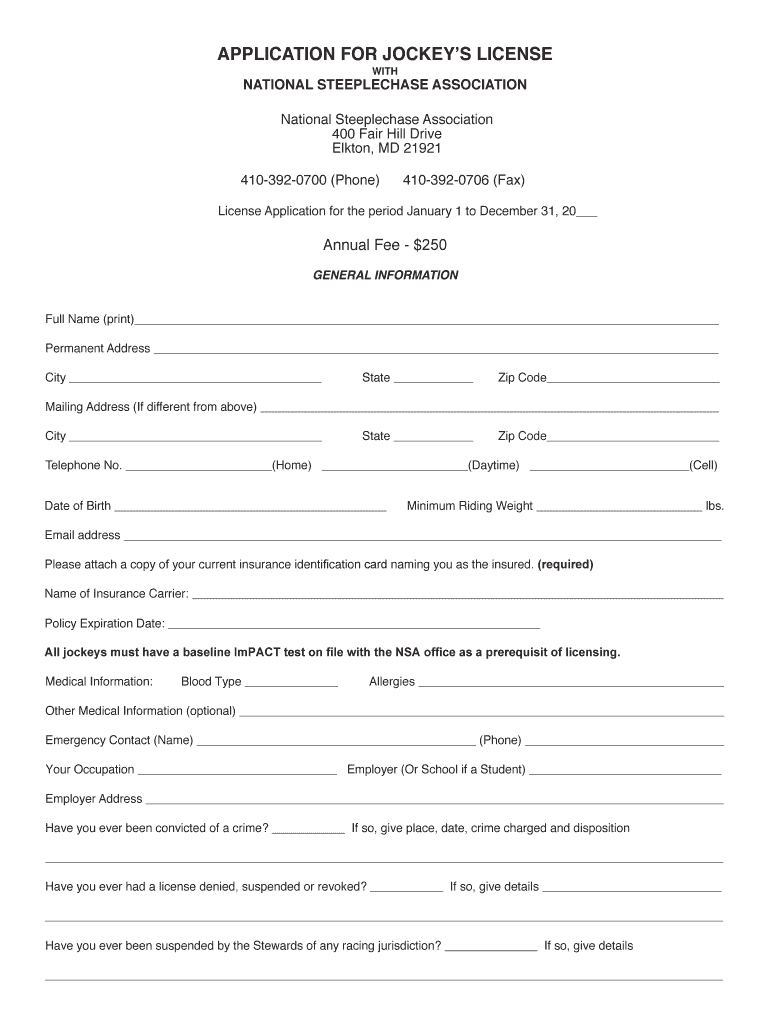 APPLICATION FOR JOCKEYS LICENSE SITUATIONAL STEEPLECHASE ASSOCIATION National Steeplechase Association 400 Fair Hill Drive Elton, MD 21921 4103920700 (Phone)4103920706 (Fax)License Application for