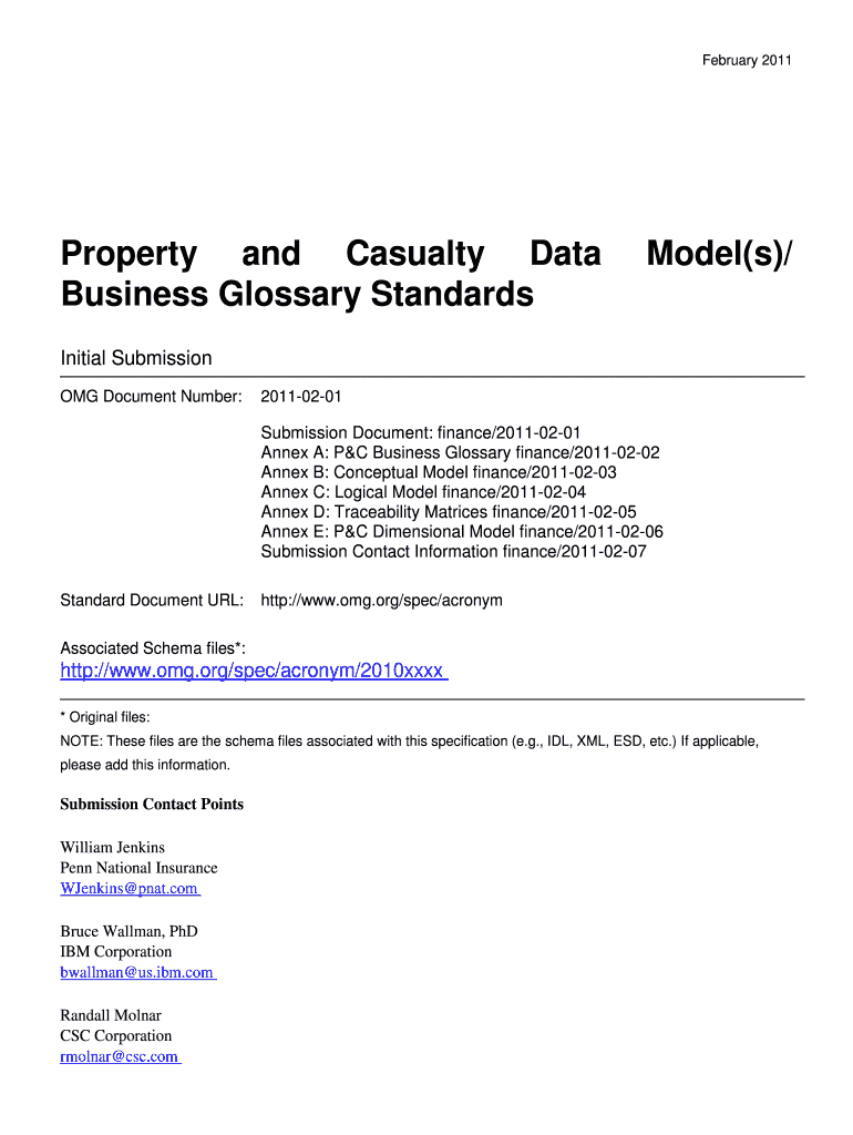 February 2011Property and Casualty Data Business Glossary StandardsModel(s)/Initial Submission OMG Document Number:20110201Submission Document: finance/20110201 Annex A: P&C Business Glossary finance/20110202