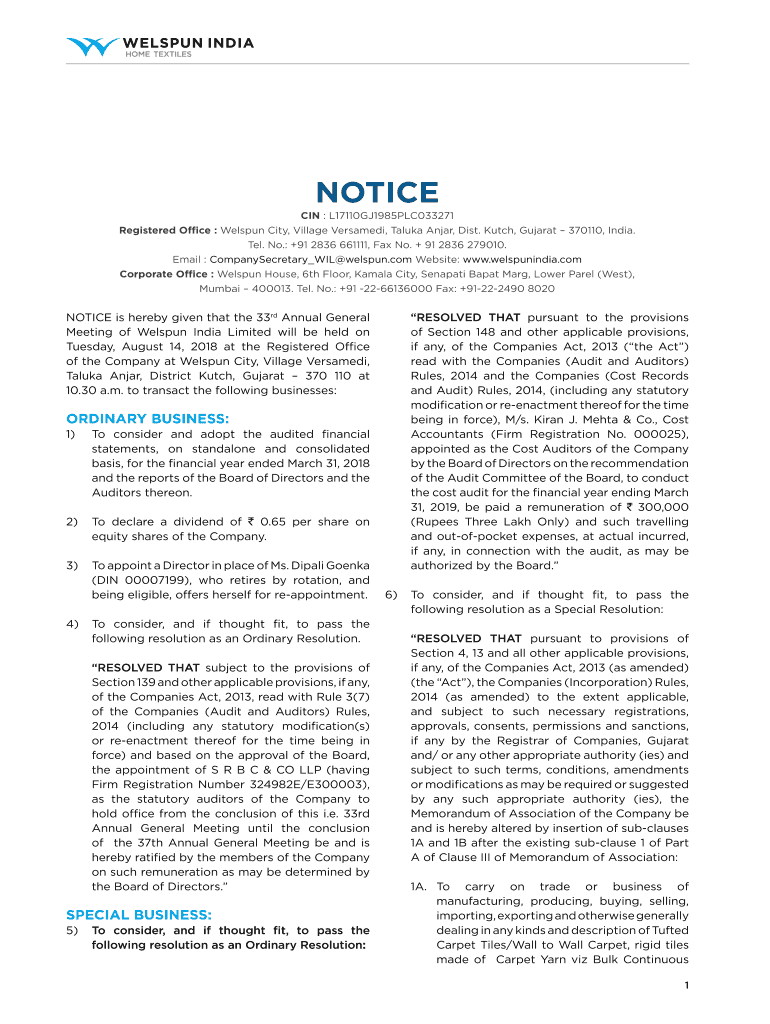 Fill out your notice - welspun india online with pdfFiller!