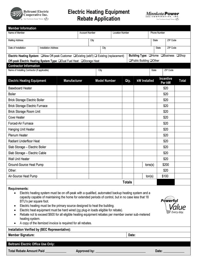 Electric Heating Equipment Rebate Application Member Information Name of MemberAccount NumberMailing Address Date of InstallationLocation NumberPhone NumberCityStateInstallation AddressCityZIP CodeStateZIP