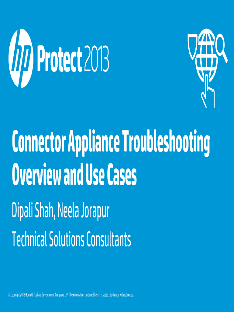 Connector Appliance Troubleshooting Overview and Use Cases Diwali Shah, Née la Jodhpur Technical Solutions Consultants Copyright 2013 Hewlett Packard Development Company, L.P. The information contained