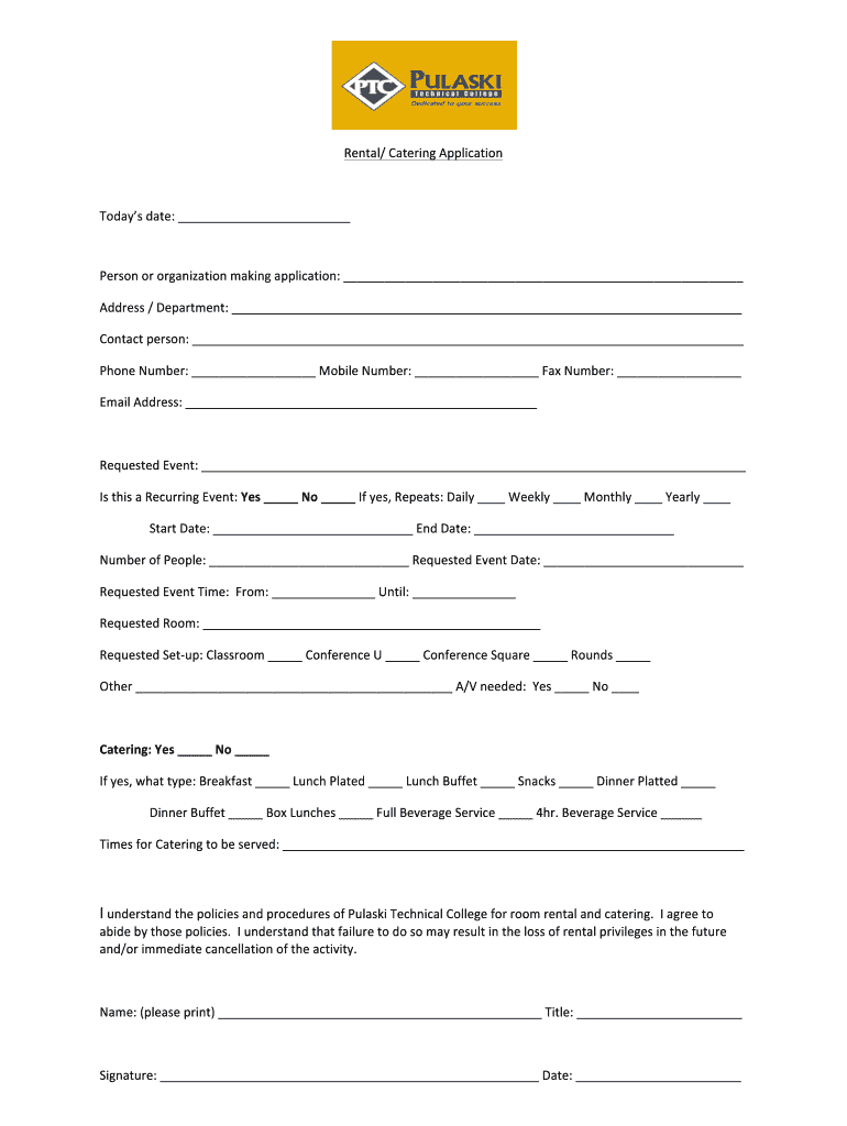 Rental/CateringApplication Todaysdate: Personororganizationmakingapplication: Address/Department: Contact person: PhoneNumber: MobileNumber: Number: Misaddress: RequestedEvent: IsthisaRecurringEvent:Yes