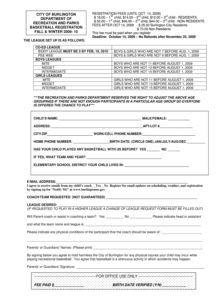 CITY OF BURLINGTON DEPARTMENT OF RECREATION AND PARKS BASKETBALL REGISTRATION FALL & WINTER 2009 10 THE LEAGUE SET UP IS AS FOLLOWS:REGISTRATION FEES (UNTIL OCT. 14, 2009) ST ND rd $18.00 1 child,