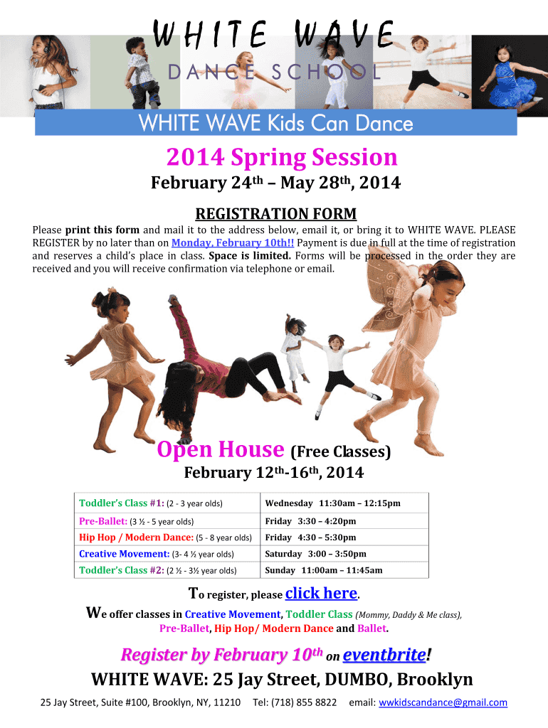 WHITE WAVE DANCE SCHOOLMATE WAVE Kids Can Dance2014 Spring Session February 24th May 28th, 2014 REGISTRATION FORM Please print this form and mail it to the address below, email it, or bring it to