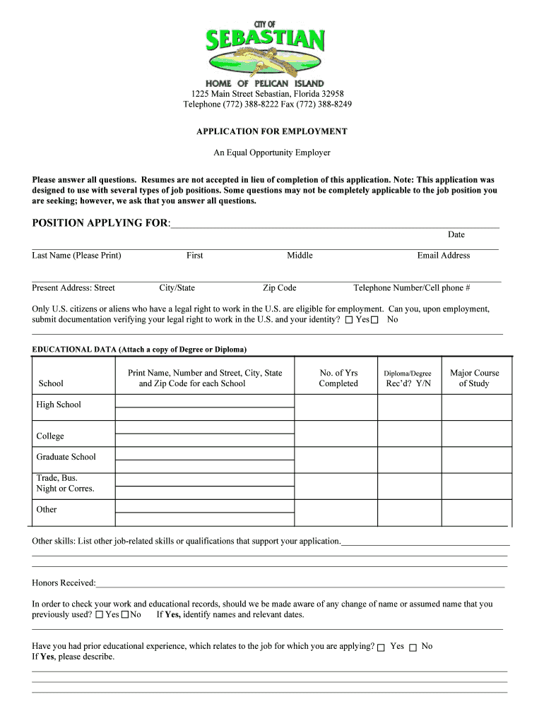 1225 Main Street Sebastian, Florida 32958 Telephone (772) 3888222 Fax (772) 3888249 APPLICATION FOR EMPLOYMENT An Equal Opportunity Employer Please answer all questions. Resumes are not accepted in