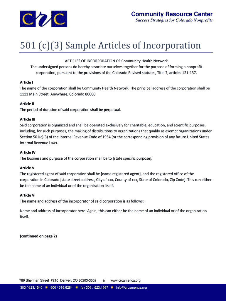 Community Resource Center Success Strategies for Colorado Nonprofits 501 (c)(3) Sample Articles of Incorporation ARTICLES OF INCORPORATION OF Community Health Network The undersigned persons do hereby