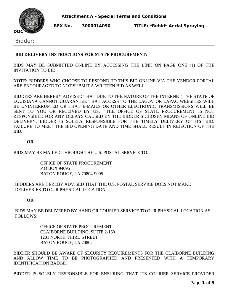 Template THE OFFICE OF STATE PROCUREMENT IS NOT RESPONSIBLE FOR ANY DELAYS CAUSED BY THE BIDDERS CHOSEN MEANS OF ONLINE BID DELIVERY instructions