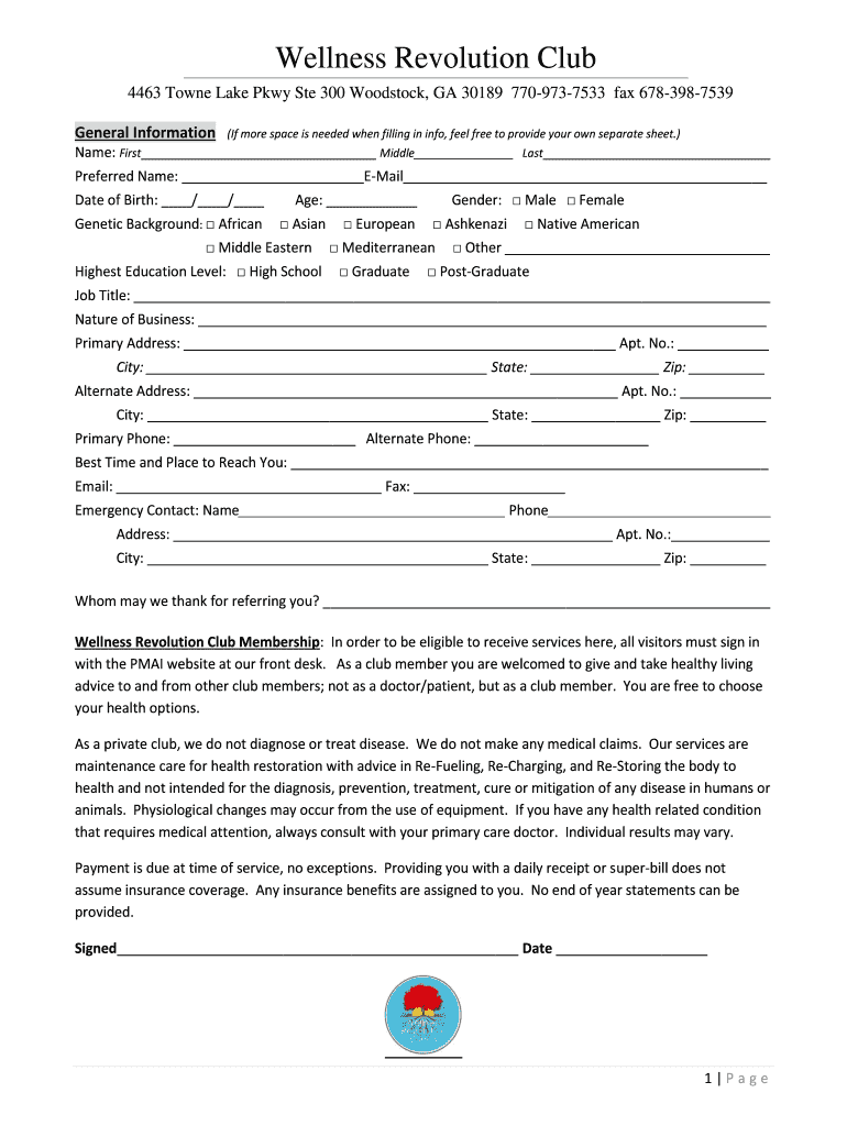 Wellness Revolution Club 4463 Town Lake Pkwy Ste 300 Woodstock, GA 30189 7709737533 fax 6783987539 General Information(If more space is needed when filling in info, feel free to provide your own separate