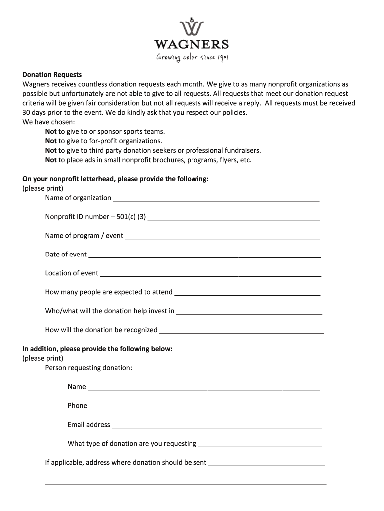 Wagner's receives countless donation requests each month. We give to as many nonprofit organizations as