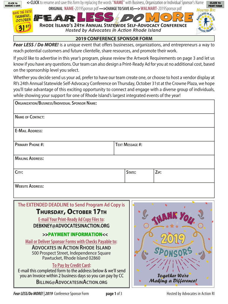 CLICK to rename and save this form by replacing the words “NAME with Business, Organization or Individual Sponsor's Name ORIGINAL: NAME2019Sponsor.pdf CHANGE TO/SAVE AS WALMART2019Sponsor.pdf2019