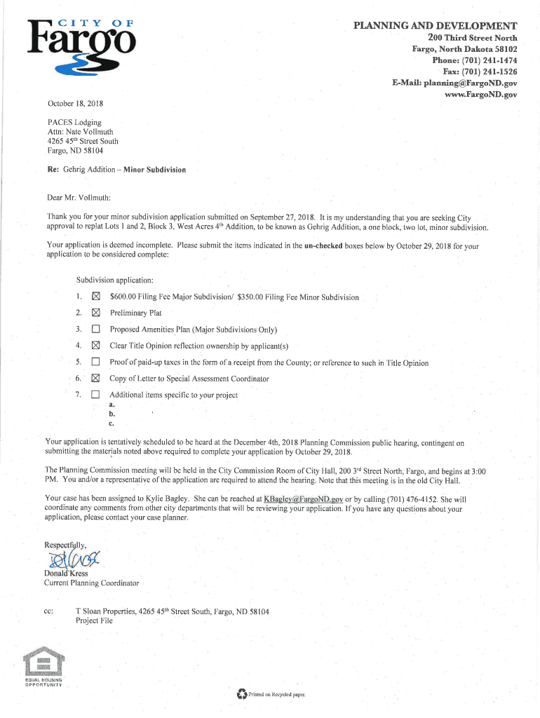 Plat (Minor)Gehrig Addition17 AVE Subject Property39 ST S40 ST S 18 AVE S Legend AG DM UGC GI GOLD LI MR1 MR2 MR3MHP NC NO P/I UMUSR2 SR3 SR4 SR5City Limits1702 40th Street South & 3926 17th Avenue