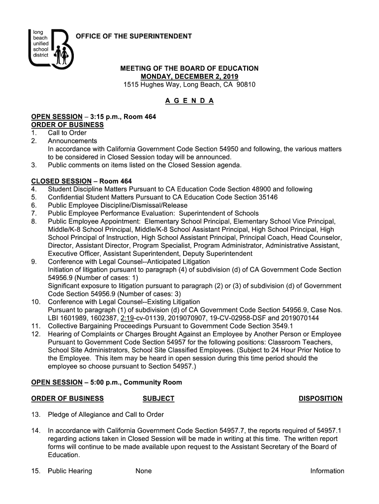 OFFICE OF THE SUPERINTENDENT MEETING OF THE BOARD OF EDUCATION MONDAY, DECEMBER 2, 2019 1515 Hughes Way, Long Beach, CA 90810 A G E N D A OPEN SESSION 3:15 p.m., Room 464 ORDER OF BUSINESS 1. Call