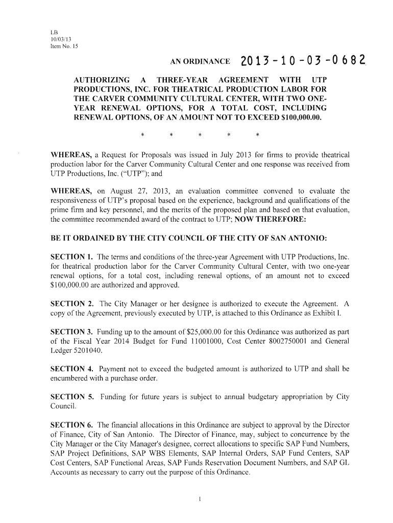 LB 10/03/13 Item No. 15AN ORDINANCE20 1 3 1 0 0 3 0 6 8 2.AUTHORIZING A THRESHER AGREEMENT WITH UTP PRODUCTIONS, INC. FOR THEATRICAL PRODUCTION LABOR FOR THE CARVER COMMUNITY CULTURAL CENTER, WITH