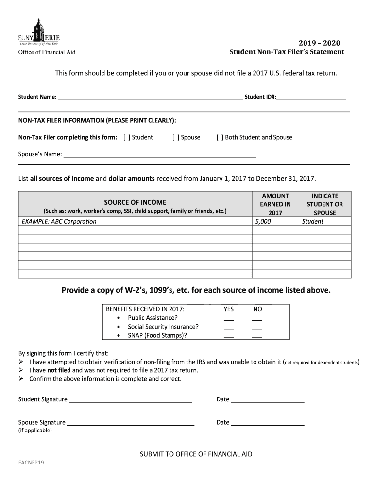 2019 2020 Student Syntax Filers StatementOffice of Financial Widths form should be completed if you or your spouse did not file a 2017 U.S. federal tax return. Student Name: Student ID#: SYNTAX FILER