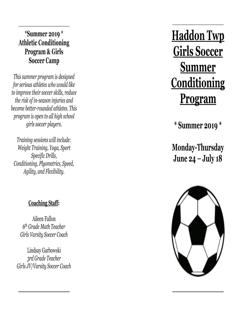 !! *Summer 2019 * Athletic Conditioning Program & Girls Soccer Camp This summer program is designed for serious athletes who would like to improve their soccer skills, reduce the risk of in season