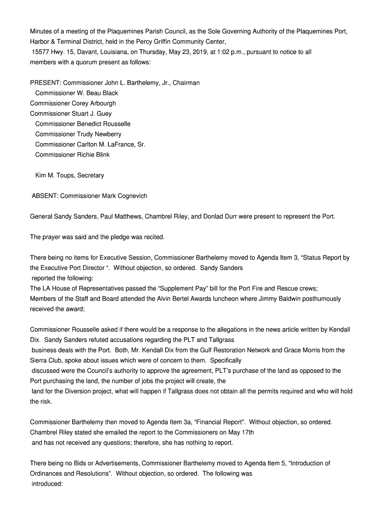 Minutes of a meeting of the Plaquemines Parish Council, as the Sole Governing Authority of the Plaque mines Port, Harbor & Terminal District, held in the Percy Griffin Community Center, 15577 Hwy.