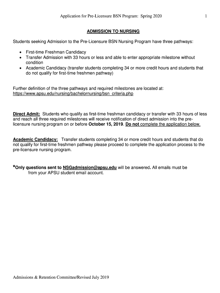 Application for Licensure BSN Program: Spring 20201ADMISSION TO NURSING Students seeking Admission to the Licensure BSN Nursing Program have three pathways: First time Freshman Candidacy Transfer