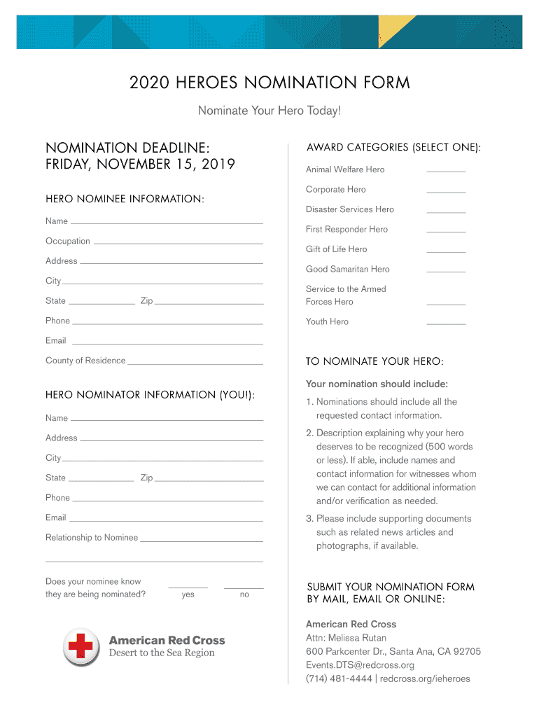 2020 INLAND EMPIRE HEROES LUNCHEONOFFICIAL NOMINATION FORM February 18, 2020, The Mission Inn Hotel & Spa Nomination deadline: November 15, 20192020 HEROES NOMINATION FORM As the community leader