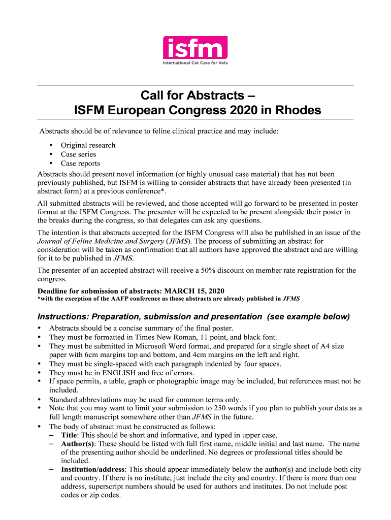 Call for Abstracts IFM European Congress 2020 in Rhodes Abstracts should be of relevance to feline clinical practice and may include: Original research Case series Case reports Abstracts should present