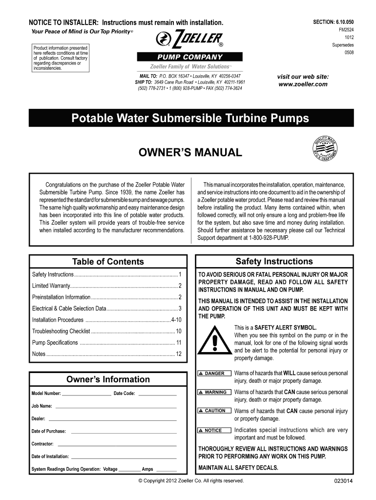 Get the free 537489 2 Zoeller Potable Water Turbine Pump Owners Manual User