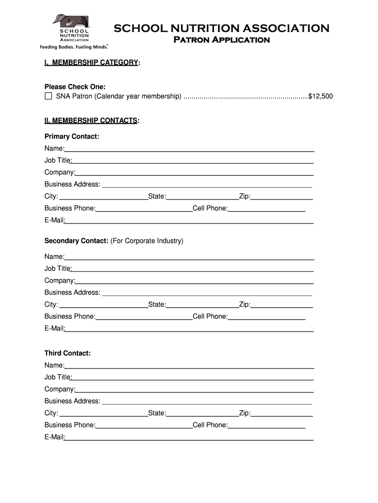 SCHOOL NUTRITION ASSOCIATION Patron Application I. MEMBERSHIP CATEGORY:Please Check One: SNA Patron (Calendar year membership) ...............................................................$12,500II.