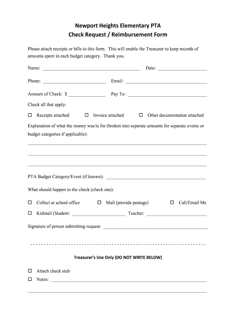 Newport Heights Elementary PTA Check Request / Reimbursement Formulas attach receipts or bills to this form. This will enable the Treasurer to keep records of amounts spent in each budget category.