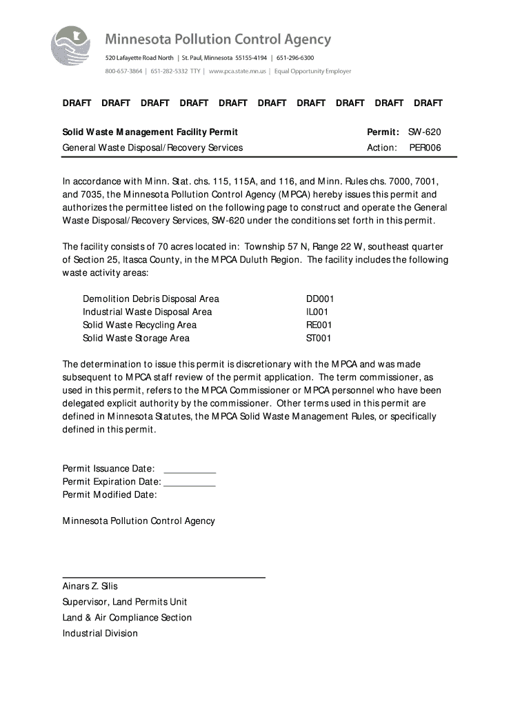 Get the free Draft Solid Waste Permit to General Waste Disposal and Recovery Services Inc, Keewat...
