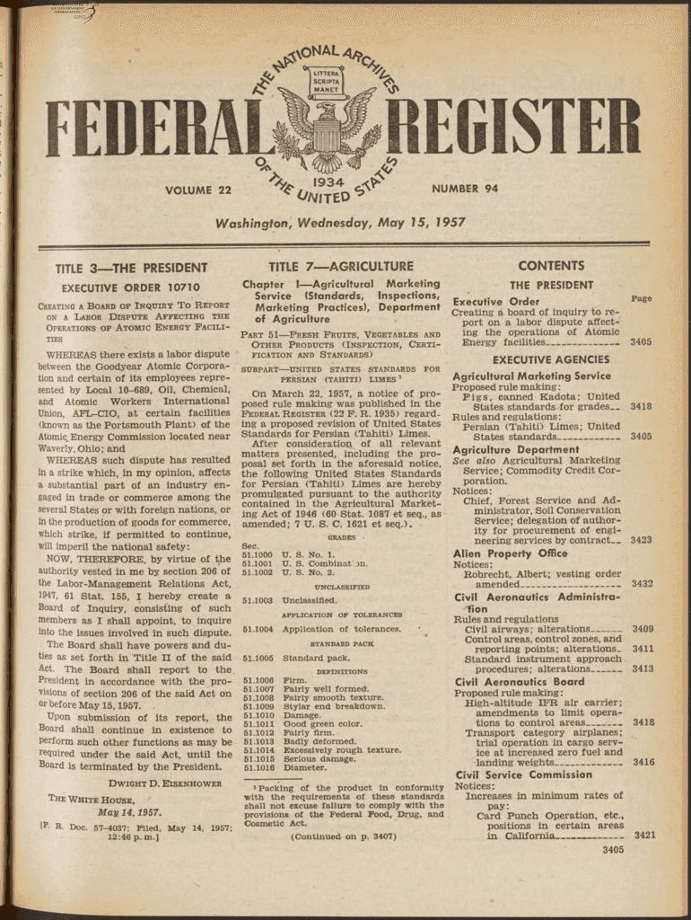 REGISTER VOLUME 221 9 3 4 P × A/ITEM NUMBER 94Washington ', Wednesday, May 15, 1957, TITLE 3 THE PRESIDENTIAL 7 AGRICULTUREEXECUTIVE ORDER 10710Chapter I Agricultural Marketing Service (Standards,